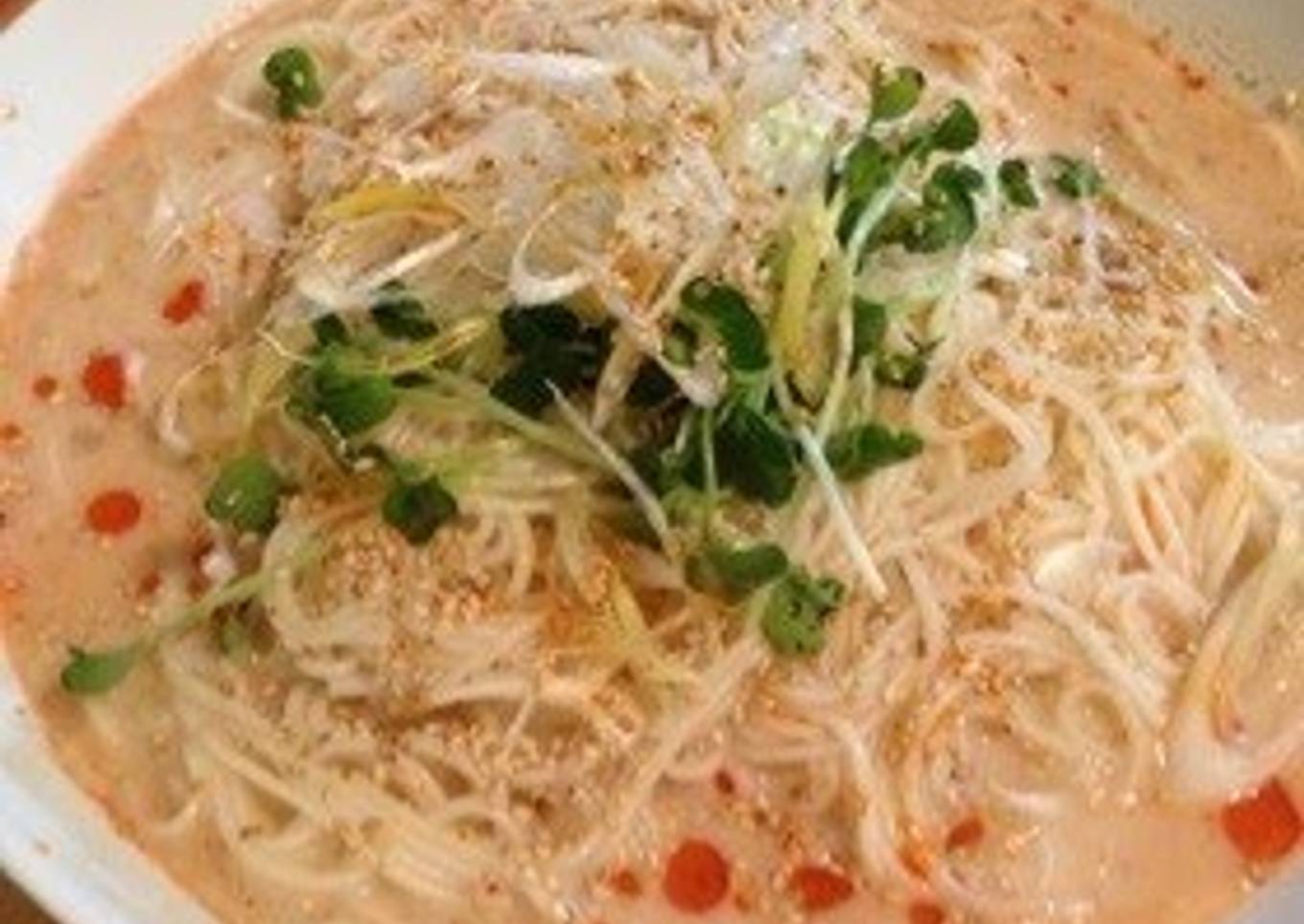 - Add the soy milk and ground sesame and mix well. Then transfer the cooked noodles to a bowl.