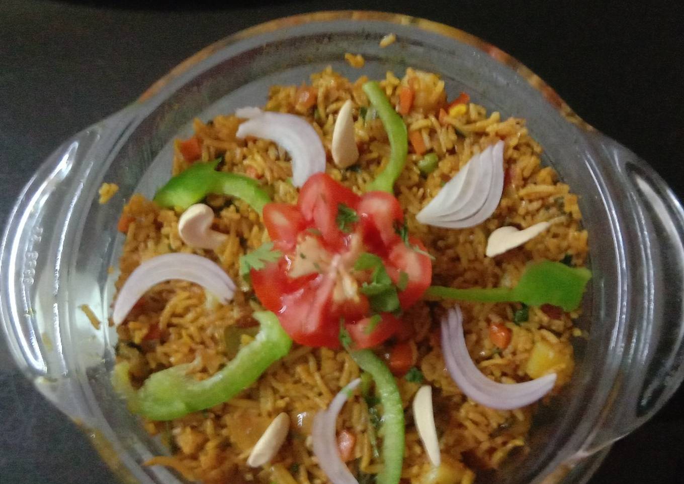- Boil rice and strain water and keep asode for cool i and anthor pan heat and boil all veg with salt now in apan heat on gas add ghee add hole masala dry mirchi tej patta addjeera and hing then lahsun garlik chop add chop onion tomato stir it add regular masala salt garammasala and add veg stir it and mix all well then add cooked rice mix all last add saute paneer and cover lid to pan for 5 mini on slow flame open lid and garnish with Coriander leaves and cashunuts and cheese