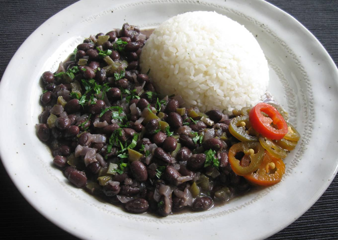 Well…, I have never been to Cuba and never tasted real Cuban food. I just read some recipes and created my own version. This is the easiest possible way to cook yummy stewed Black Beans. And please note that pickled Jalapeños go very well with this dish.